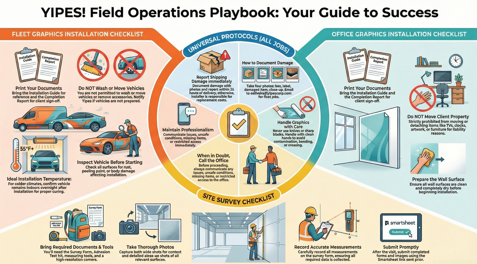 - 🔧 If unexpected graphic removal is required, contact Yipes before proceeding for client approval and added charges before proceeding.